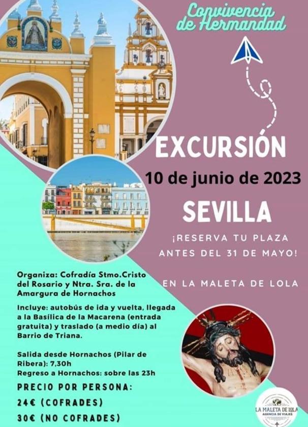 La Cofradía del Stmo.Cristo del Rosario y Ntra. Sra. de la Amargura organiza una excursión a Sevilla el próximo 10 de junio. El precio será de 24 euros por persona e incluye el transporte en autobús y las visitas libres a la Basílica de la Macarena (entrada gratuita) y al barrio de Triana.